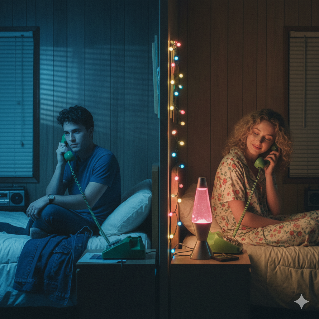 “Hyper-photorealistic 1980s split-bedroom editorial – two early-twenties lovers on vintage wall-mounted rotary phones, divided by a single wall. Left: his room in the warm, golden hour light of sunset; right: hers illuminated by the flickering glow of a TV screen in a darkened room. Capture a feeling of shared secrets. Shot straight-on with Pentax K1000 + 50 mm f/2, ISO 200, 1/125 s, WB 3200 K. Render 8 K Cinestill 800T film style with cinematic warmth, deep shadows, fine halation, and subtle depth-of-field.”
