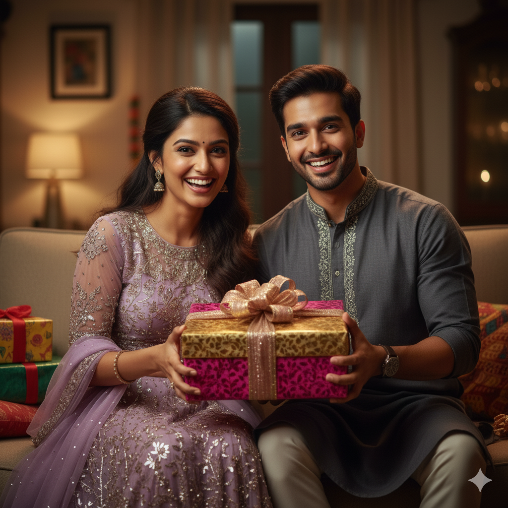 Ultra-realistic 8K DSLR festive close-up portrait of the same young Indian couple. They are holding a large, ornately decorated gift box together, looking directly at the camera with excited smiles. The young woman is in a chic lavender-colored fusion outfit (long skirt and embellished top). The young man is in a modern grey kurta with intricate collar detailing. The gift box is wrapped in shimmering paper with a large, festive bow. The background is a soft blur of other wrapped gifts and subtle festive decor, suggesting a gift-exchange moment. Cinematic shallow depth of field, ultra-realistic festive skin tones, 8K hyper-detailed sharpness.