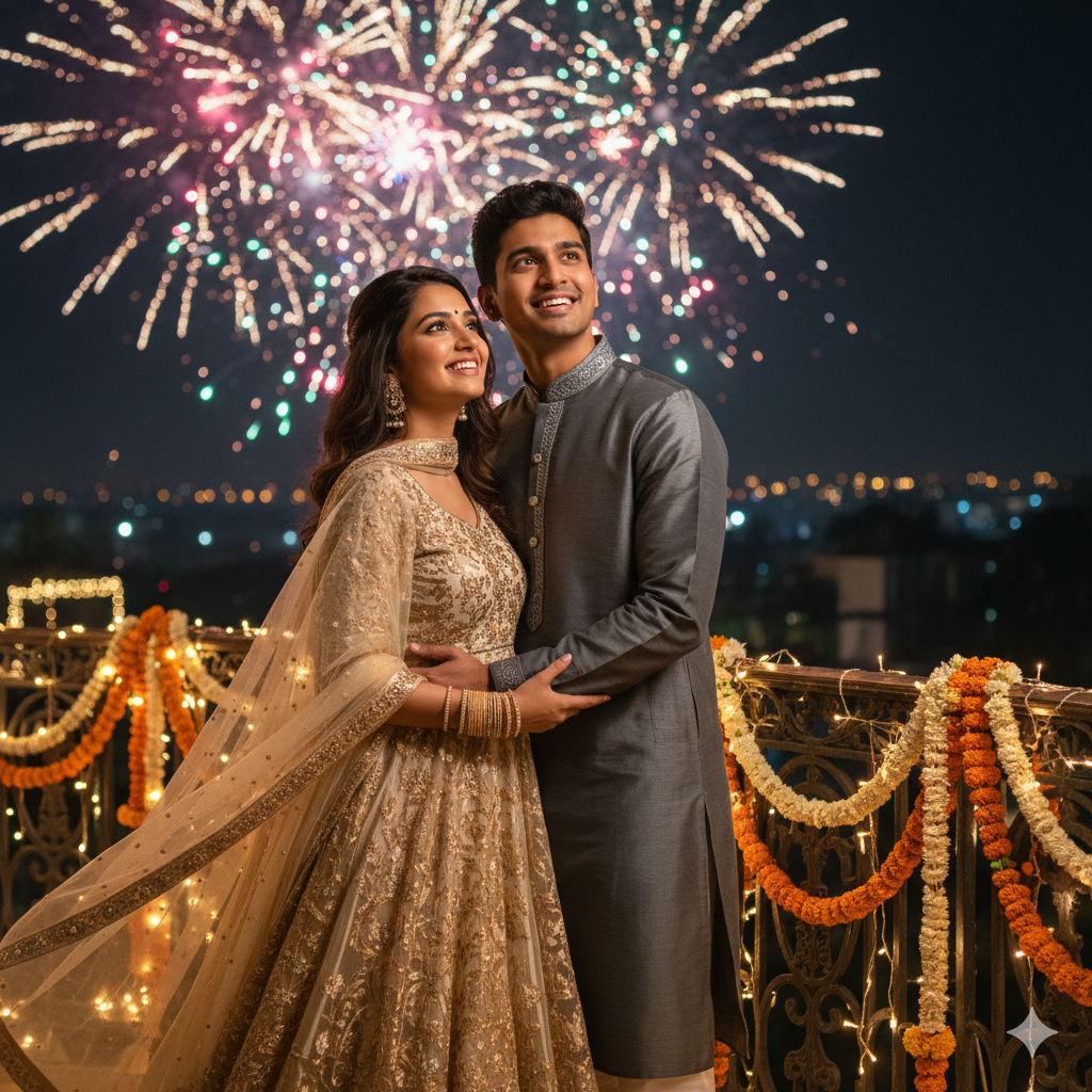 Ultra-realistic 8K DSLR festive close-up portrait of the same young Indian couple. They are standing outside on a decorated balcony, gazing upwards with delighted smiles at a display of colorful, blurred fireworks in the night sky. The young woman wears a modern golden and ivory Anarkali suit with a flowing dupatta, her face softly lit by the sparks. The young man is in a sophisticated charcoal grey kurta with minimal silver detailing, his arm gently around her waist. The balcony railings are adorned with strings of twinkling LED lights and fresh flower garlands. Cinematic shallow depth of field, ultra-realistic festive skin tones, 8K hyper-detailed sharpness.