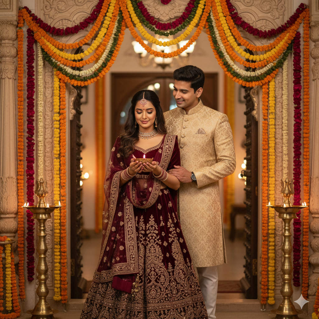 Ultra-realistic 8K DSLR festive close-up portrait of the same young Indian couple. They are standing in front of a grand entrance, heavily decorated with cascading marigold and rose garlands and ornate brass lamps. The young woman, in a striking burgundy velvet lehenga with heavy gold embroidery, is holding a small, intricate aarti lamp. The young man, in a regal gold brocade sherwani, stands slightly behind her, looking at her with admiration. The background is a soft blur of a well-lit traditional Indian home interior. Cinematic shallow depth of field, ultra-realistic festive skin tones, 8K hyper-detailed sharpness.