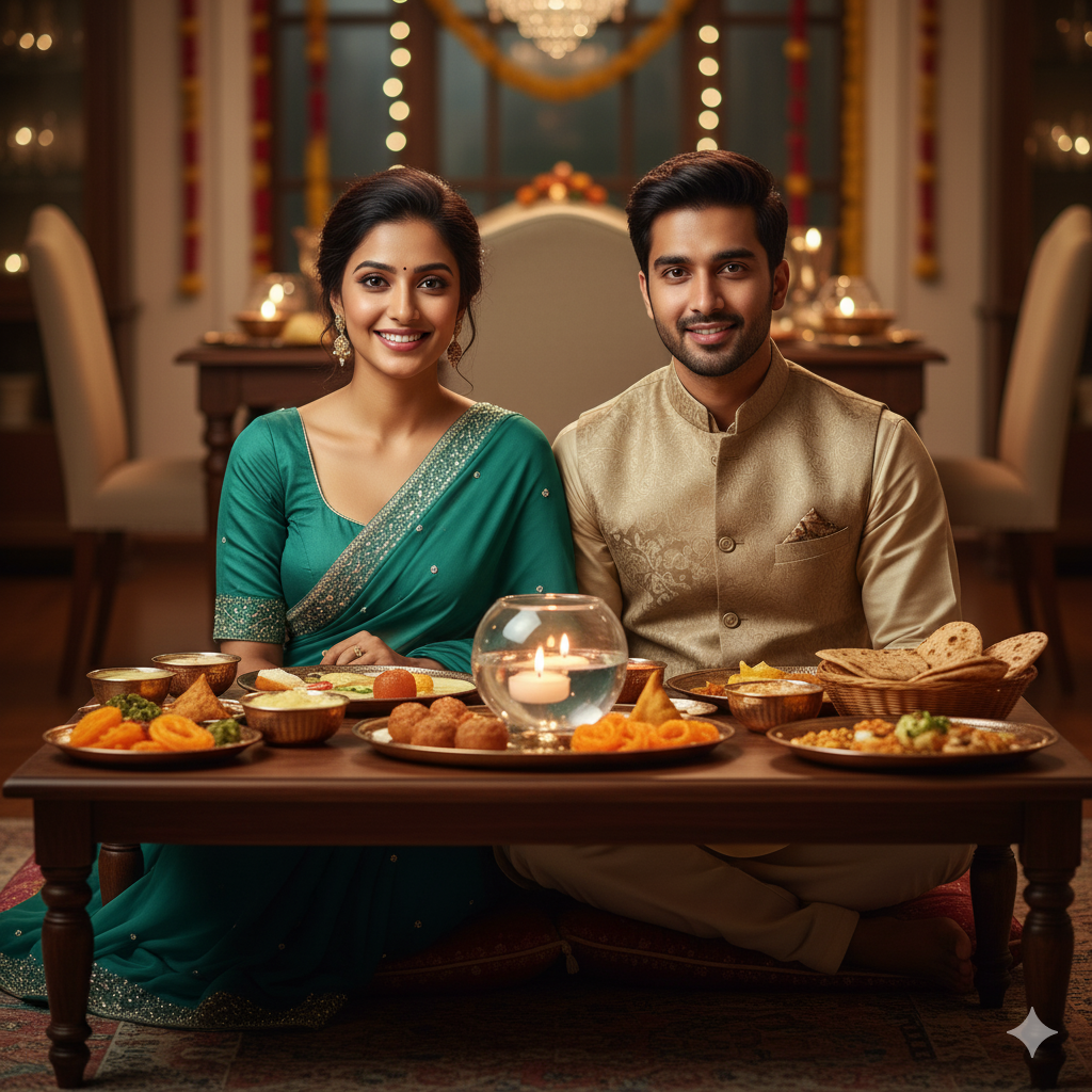 Ultra-realistic 8K DSLR festive close-up portrait of the same young Indian couple. They are seated at a low, beautifully set dining table, about to partake in a festive meal, looking at the camera with joyful anticipation. The young woman is in a graceful teal green chiffon saree with pearl embellishments. The young man wears a smart beige raw silk kurta with matching jacket. The table is adorned with a variety of traditional Diwali delicacies and sweets, along with a centerpiece of floating candles in a glass bowl. The background shows a warmly lit dining room with blurred festive hangings. Cinematic shallow depth of field, ultra-realistic festive skin tones, 8K hyper-detailed sharpness.