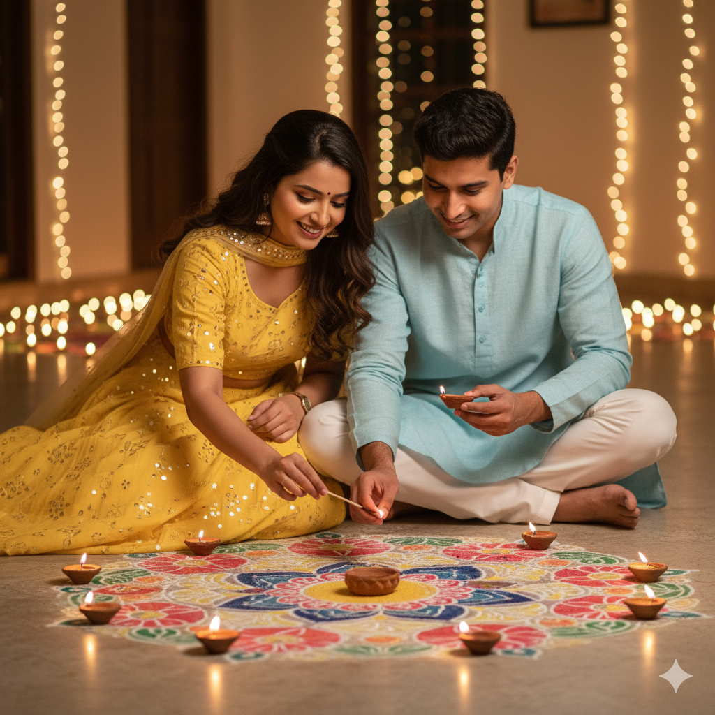 Ultra-realistic 8K DSLR festive close-up portrait of the same young Indian couple. They are seated on the floor around a beautifully crafted rangoli design, actively engaged in lighting small clay diyas. The young woman is in a cheerful yellow cotton lehenga with mirror work, her hands carefully tending to a diya. The young man wears a comfortable light blue linen kurta, his eyes focused on the task, a gentle smile on his face. The background shows more blurred rangoli patterns and the warm, inviting glow of numerous lit diyas. Cinematic shallow depth of field, ultra-realistic festive skin tones, 8K hyper-detailed sharpness.