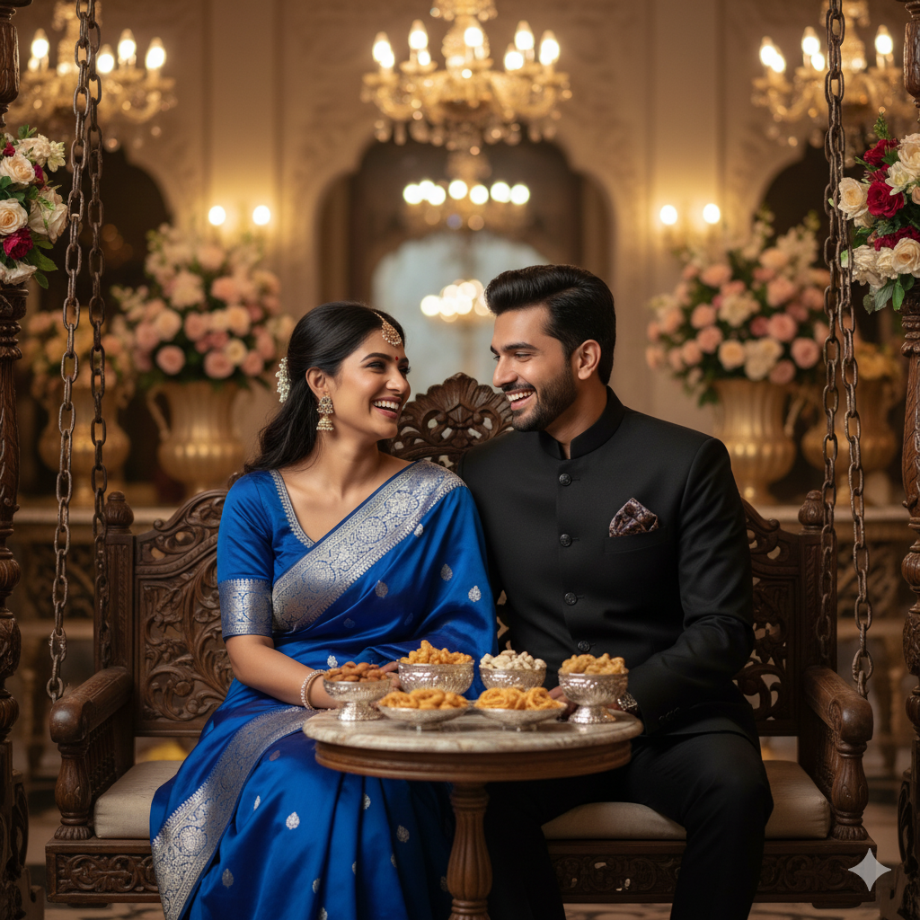 Ultra-realistic 8K DSLR festive close-up portrait of the same young Indian couple. They are seated on a grand, intricately carved wooden swing (jhoola), looking at each other and laughing. The young woman is dressed in a vibrant royal blue georgette saree with silver Zari work, her hair adorned with a delicate hairpiece. The young man is in a stylish black bandhgala suit with a patterned pocket square. Between them, small bowls of dry fruits and traditional Diwali snacks are arranged on a side table. The background features a softly blurred, opulent indoor setting with large floral arrangements and golden chandeliers. Cinematic shallow depth of field, ultra-realistic festive skin tones, 8K hyper-detailed sharpness.