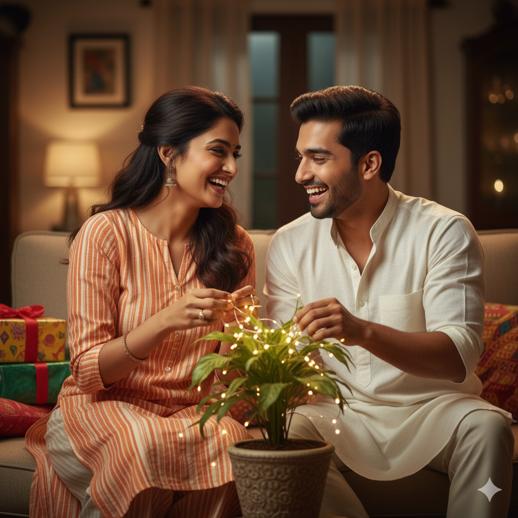 Ultra-realistic 8K DSLR festive close-up portrait of the same young Indian couple. They are playfully engaged in decorating a small, indoor plant with fairy lights, looking at each other and laughing. The young woman is in a comfortable yet stylish orange and cream striped kurti with casual palazzo pants. The young man wears a simple white short kurta with rolled-up sleeves. Their hands are near the plant, with a string of golden LED lights draped around it. The background is a blurred, cozy living room setting with soft ambient lighting and a few gift-wrapped boxes. Cinematic shallow depth of field, ultra-realistic festive skin tones, 8K hyper-detailed sharpness.